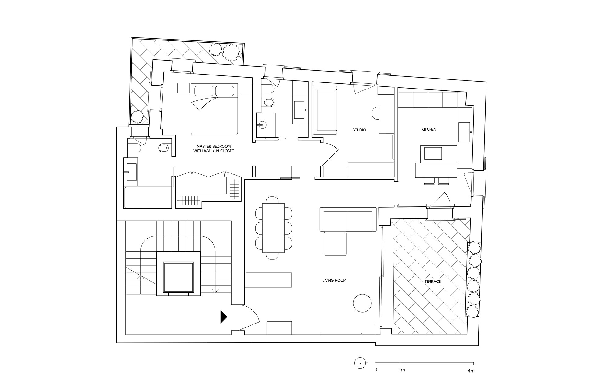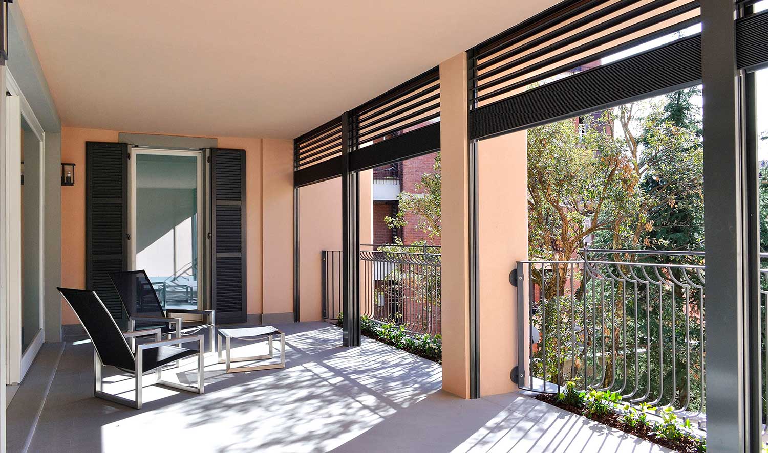 La zona living e la cucina si affacciano sulla grande terrazza loggiata. La zona notte, con camera padronale, ampia cabina armadio e bagno, si completa con la camera studio e un secondo bagno per gli ospiti.