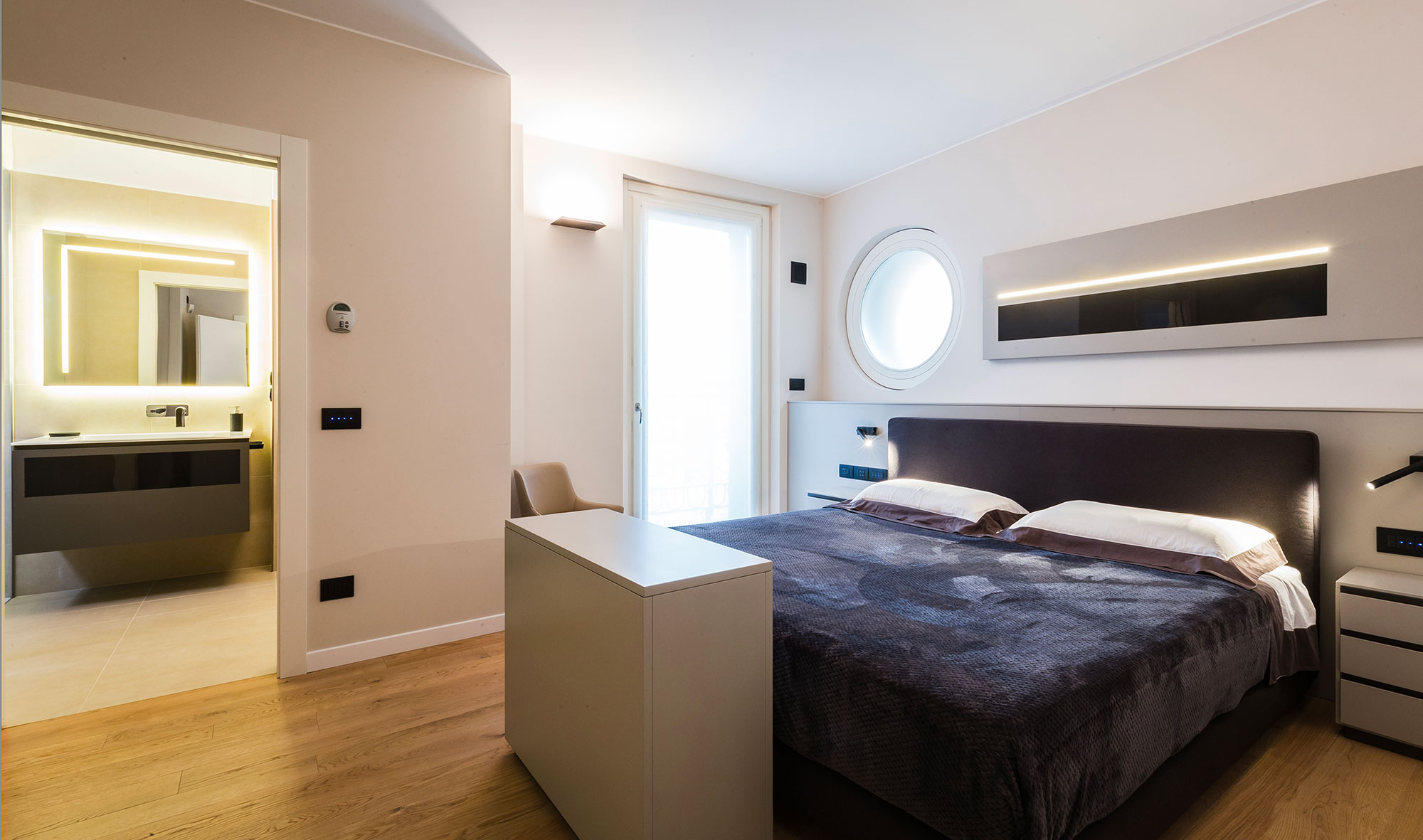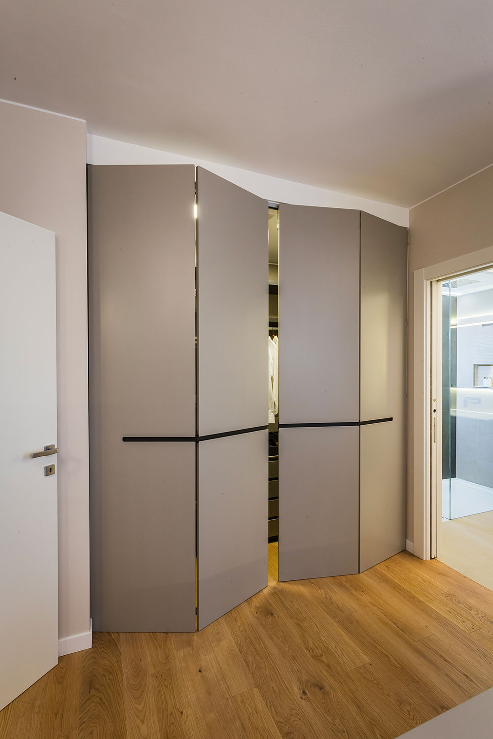 La camera padronale ha un bagno con doccia walk-in e una cabina armadio con ante apribili senza soluzione di continuità a pavimento.