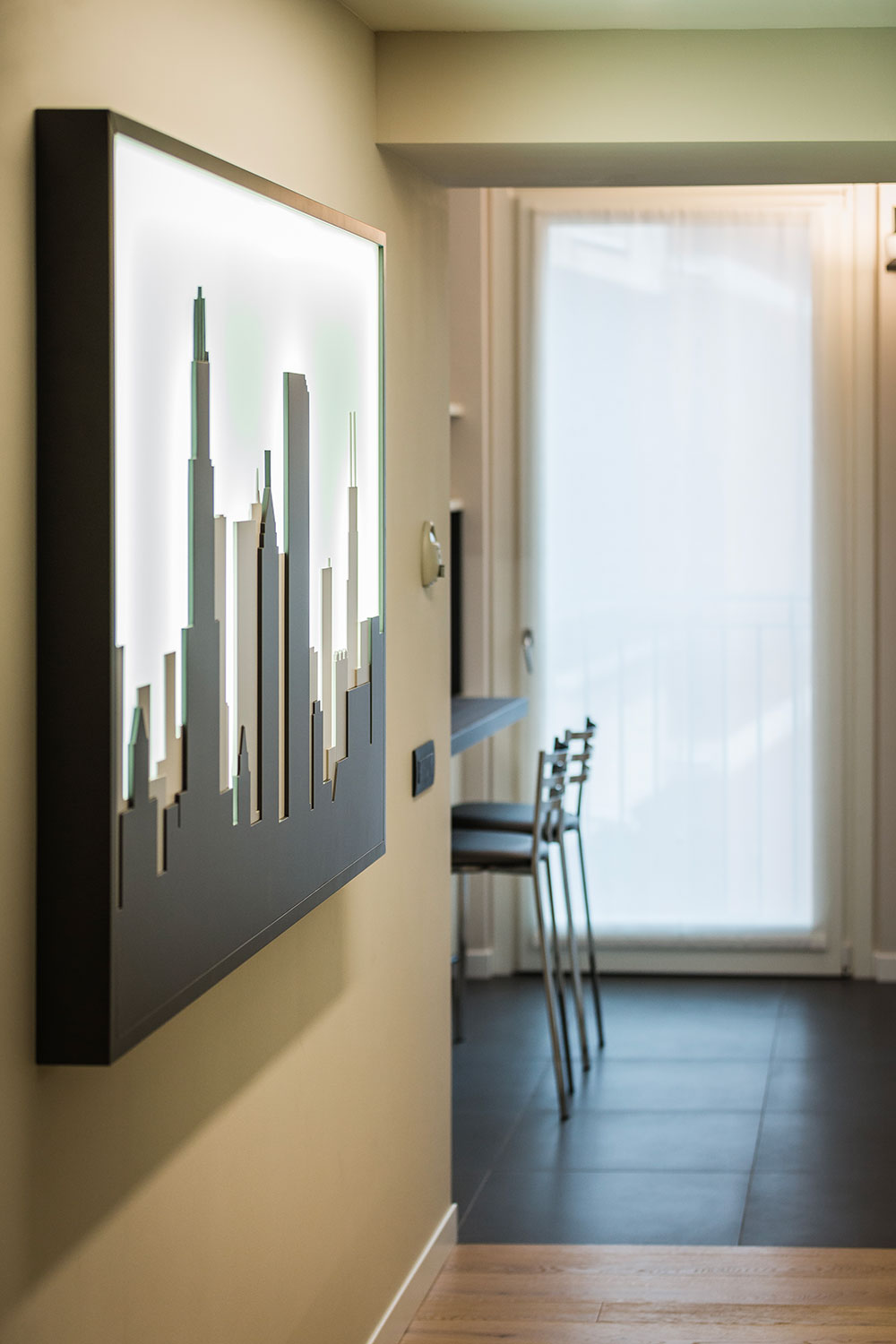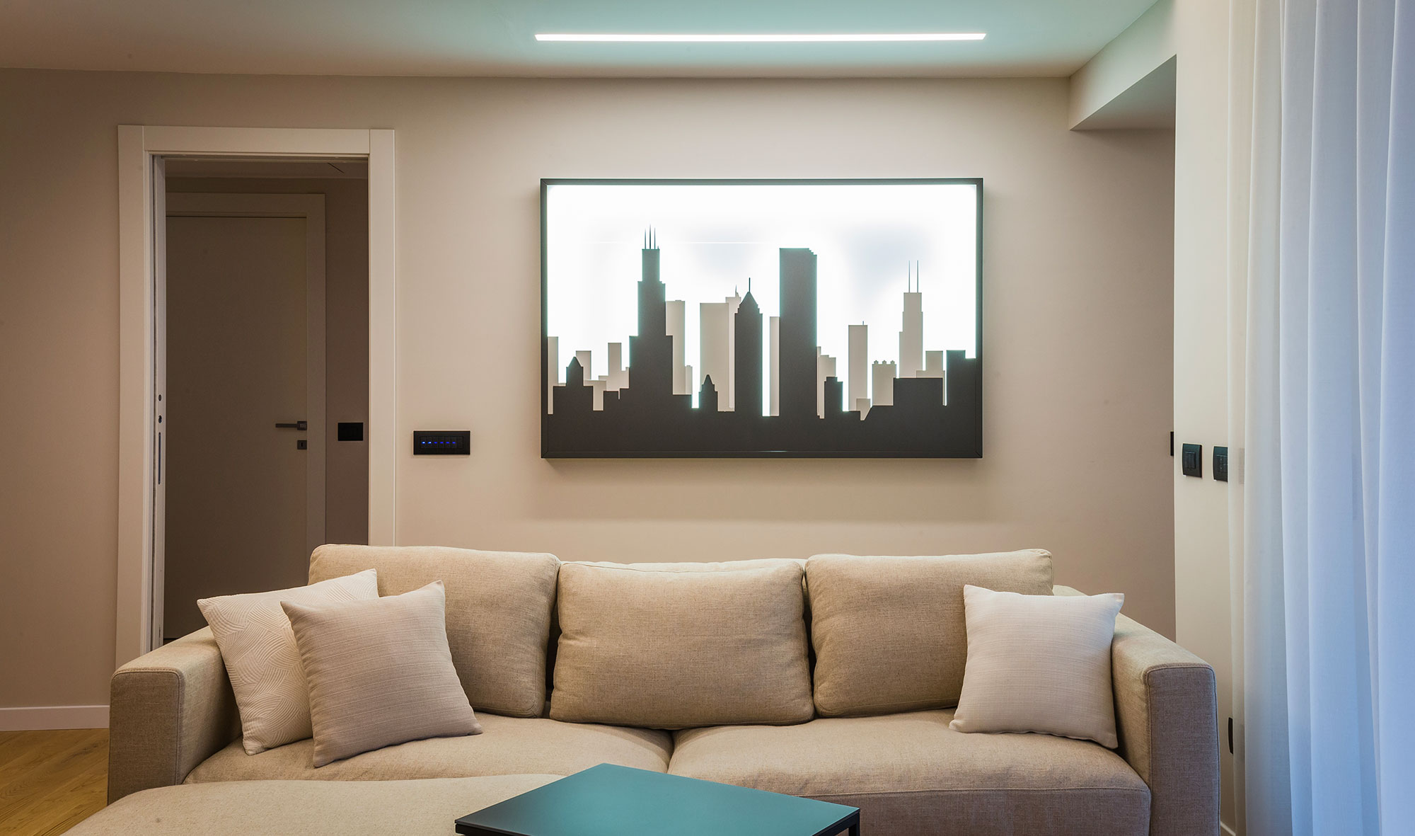 Sulla parete del living, lo skyline di Chicago si trasforma in fonte luminosa, donando alla parete un grande effetto scenografico.