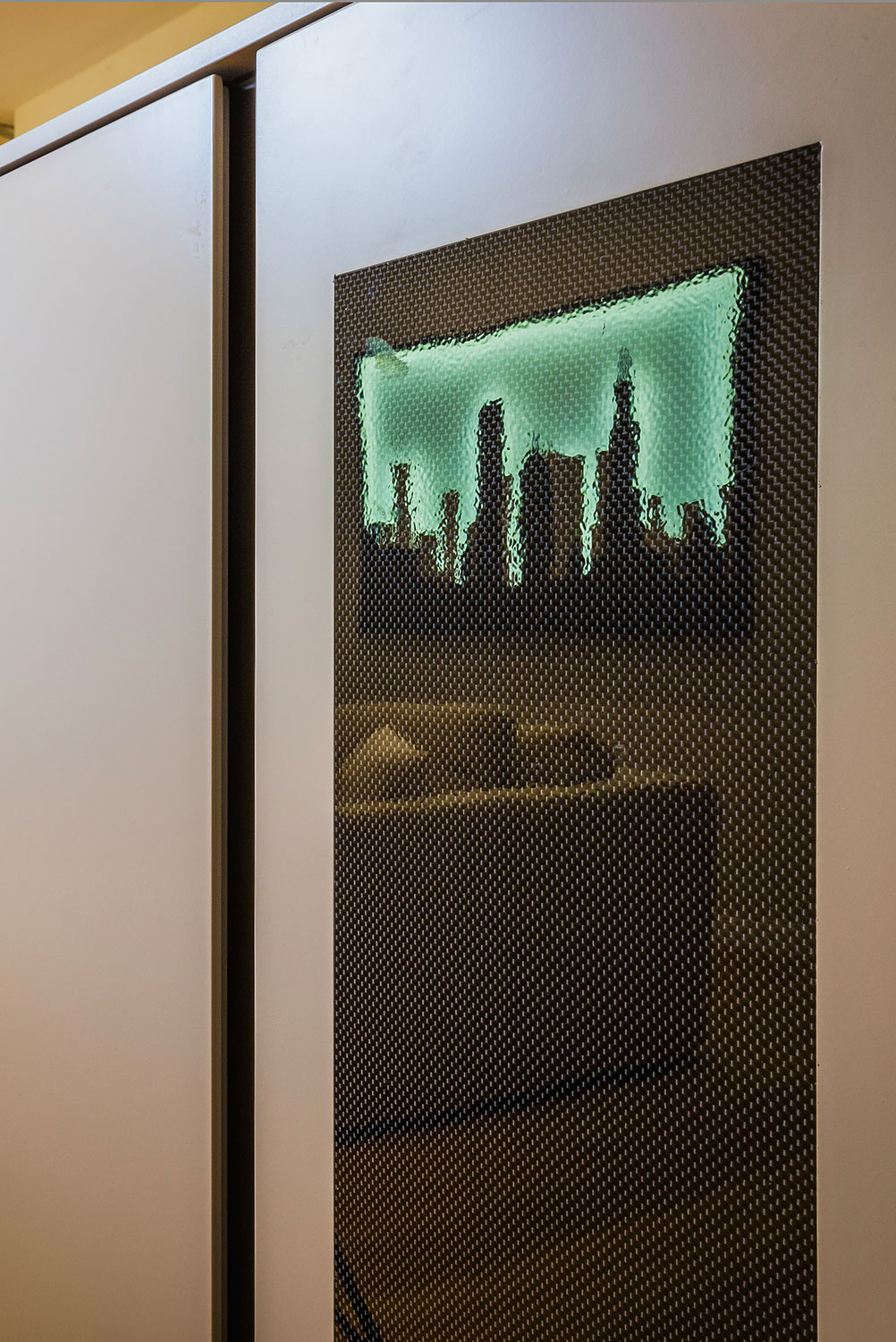 Inserti in fibra di carbonio conferiscono caratteristica unica ad ante e pannellature di rivestimento, donando al design degli interni un carattere maschile, sportivo e raffinato.