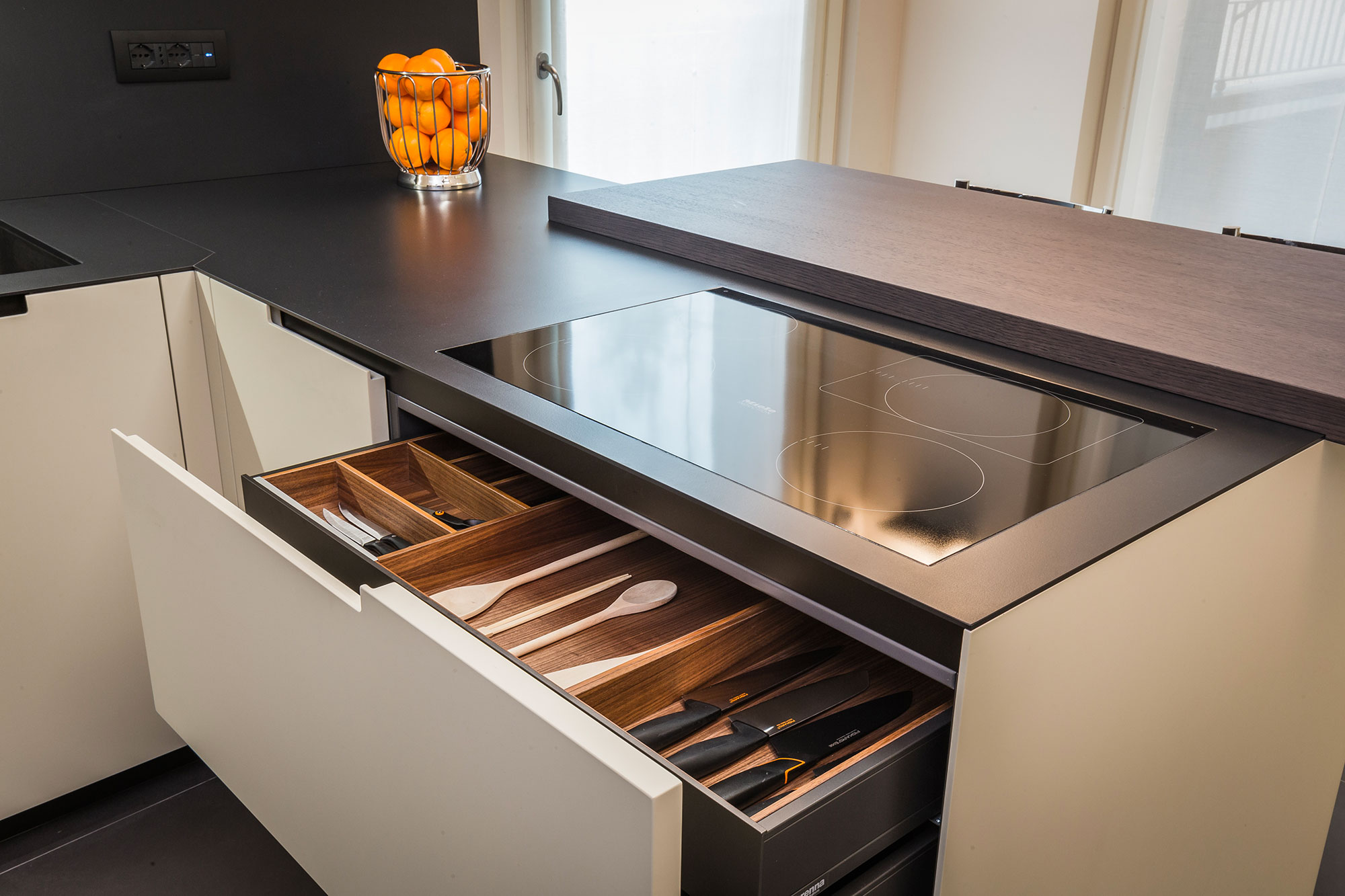 l’essenza di rovere negli arredi personalizza cassetti e scomparti.