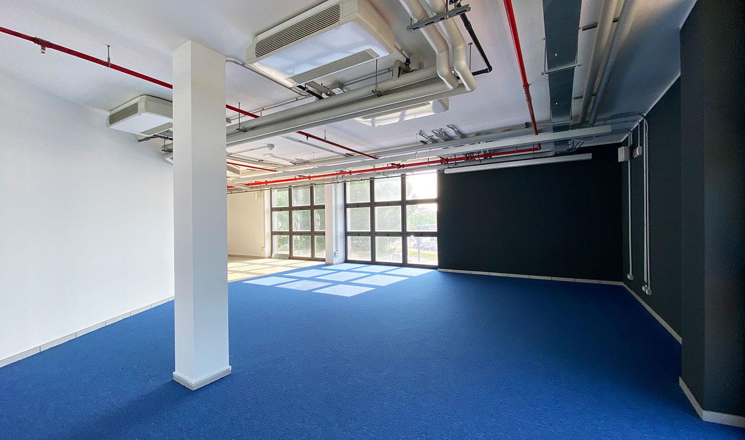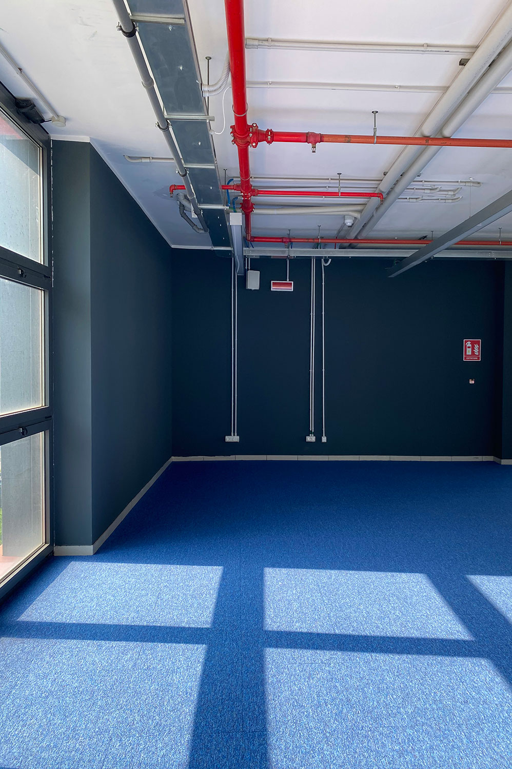 Gli impianti lasciati a vista con i caratteristici tubi rossi scandiscono il ritmo dello spazio e ne esaltano il carattere tecnico e industriale.